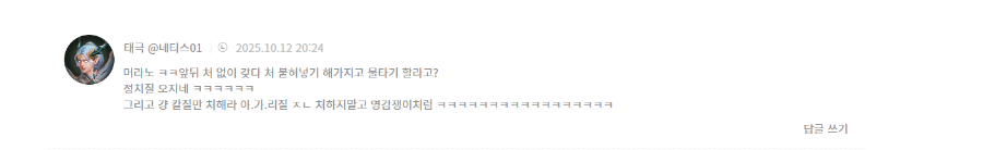 예 .. 정치질 하지마시고 칼질만 조용히 하세요.근데 님들 러프님 빼고 썰자하긴 하세요? pvp 랭킹좀 보시죠 ^^