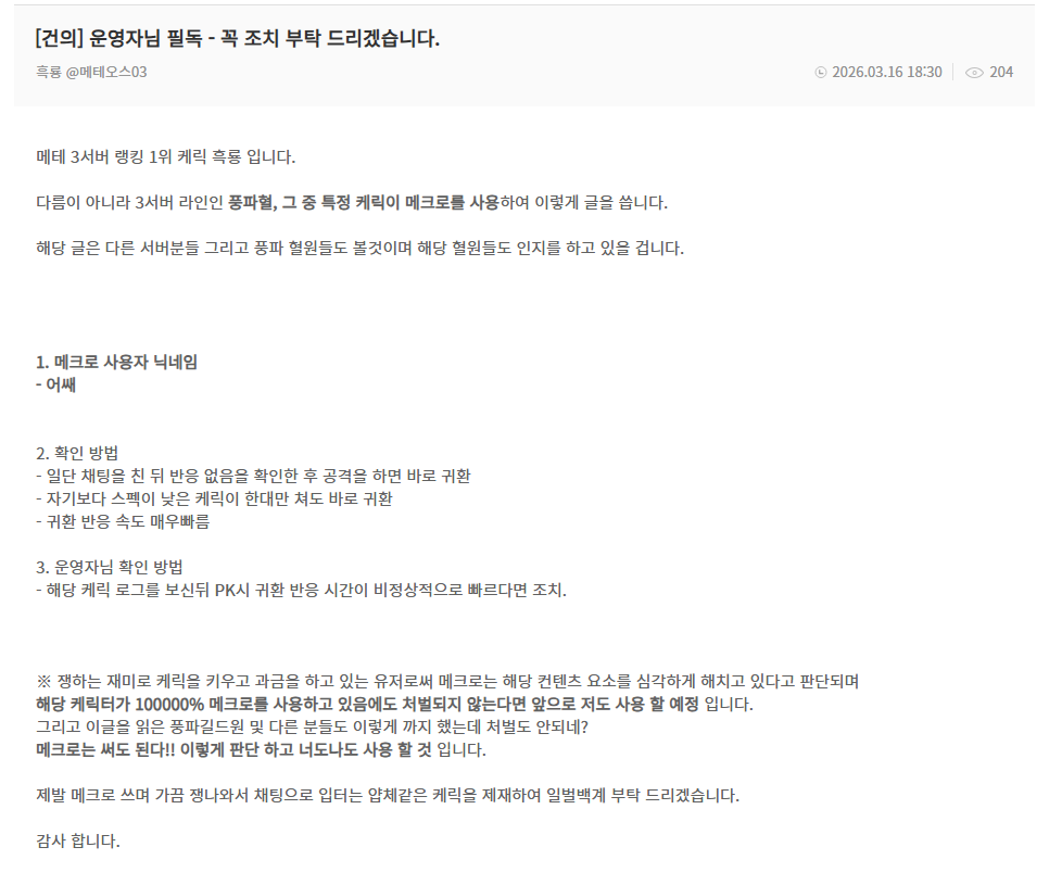 [건의] 메크로 사용자 제재 요청(2번째)