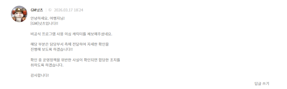 게임 로그 확인후 꼭 제재 부탁 드리겠습니다.