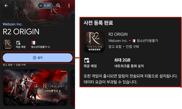 2) R2 ORIGIN 앱을 클릭한 다음 아래의 [설치] 버튼을 클릭하면 사전등록 완료!