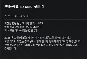 공지에서 5회 이하는 실수로 인정한다고 하셨으면서, 83회는 전액 회수라는 기준은 매우 자의적입니다. 62,250 다이아(약 124만 원 상당)를 회수하겠다는 통보는 사실상 버그를 유발하고 강제 결제로 이어지는 요구로 느껴질 수밖에 없습니다. 문제 발생 시 개별 추적을 통해 원상 복구가 가능함에도, 계정 정지 압박과 3차례에 걸친 회수 독촉으로 다이아 결제를 유도하는 방식은 결코 공정하지 않습니다.
